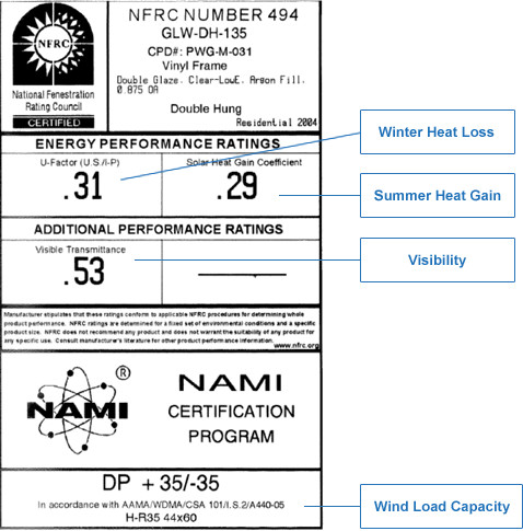 We sell NFRC certified windows and doors. NFRC is a non-profit organization that administers the only uniform, independent rating and labeling system for the energy performance of windows and doors. The NFRC is approved as an EPA-recognized Certification Body for the ENERGY STAR Program. Example Label: