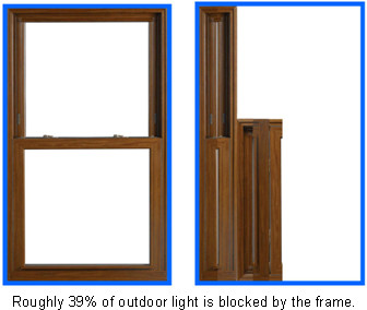 The Visibility number is measured on a scale of 0 to 1. The higher the Visibility number the more light you see. The number is a percentage. So a Visibility of .50 means 50% of outdoor light is entering your home. As seen in the picture above, the frame blocks almost 40% of the visibility depending on the size of the window. Adding glass dividers will block an additional 4 to 11 percent of your visibility. Low-e glass coatings will reduce Visibility as well. Beware of window companies that measure the center of the glass. These numbers will be higher but you are not buying just the center of the glass, you are buying an entire window. Our numbers represent the entire window -including the frame.